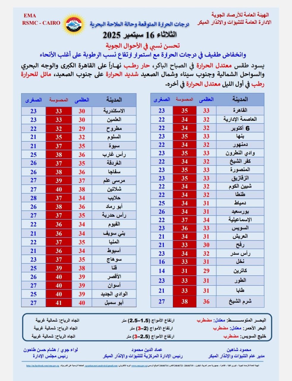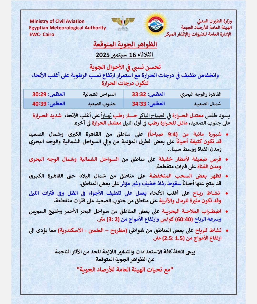 اعلنت الهيئة العامة للأرصاد الجوية ان حالة الطقس غدا الثلاثاء 16 سبتمبر 2025 ستشهد انخفاض طفيف في درجات الحراره مع استمرار الارتفاع النسبي في الرطوبة على اغلب الانحاء، لتسجل درجه الحراره في السواحل الشمالية 29 الى 30 للعظمى وفي جنوب الصعيد 39 الى 40 للعظمى وفي القاهرة الكبرى والوجه البحري 32 الى 33 العظمى في شمال الصعيد 33 الى 34 العظمى.