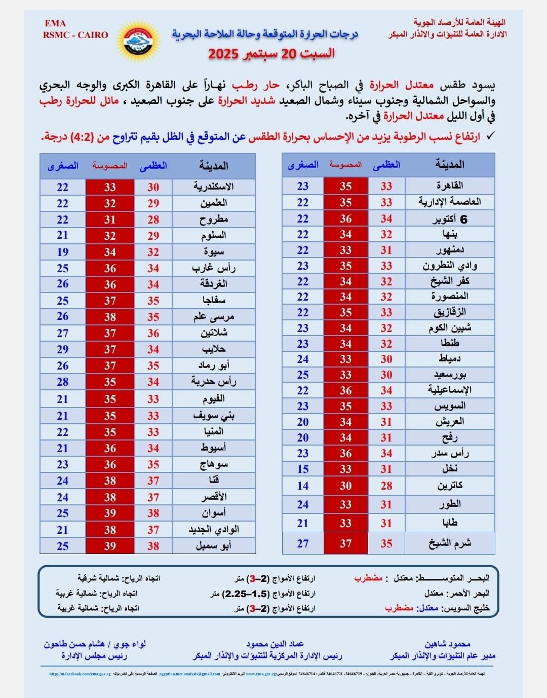 جاءت درجات الحراره المتوقعة اليوم السبت 20 سبتمبر 2025 على اغلب الانحاء كالتالي..