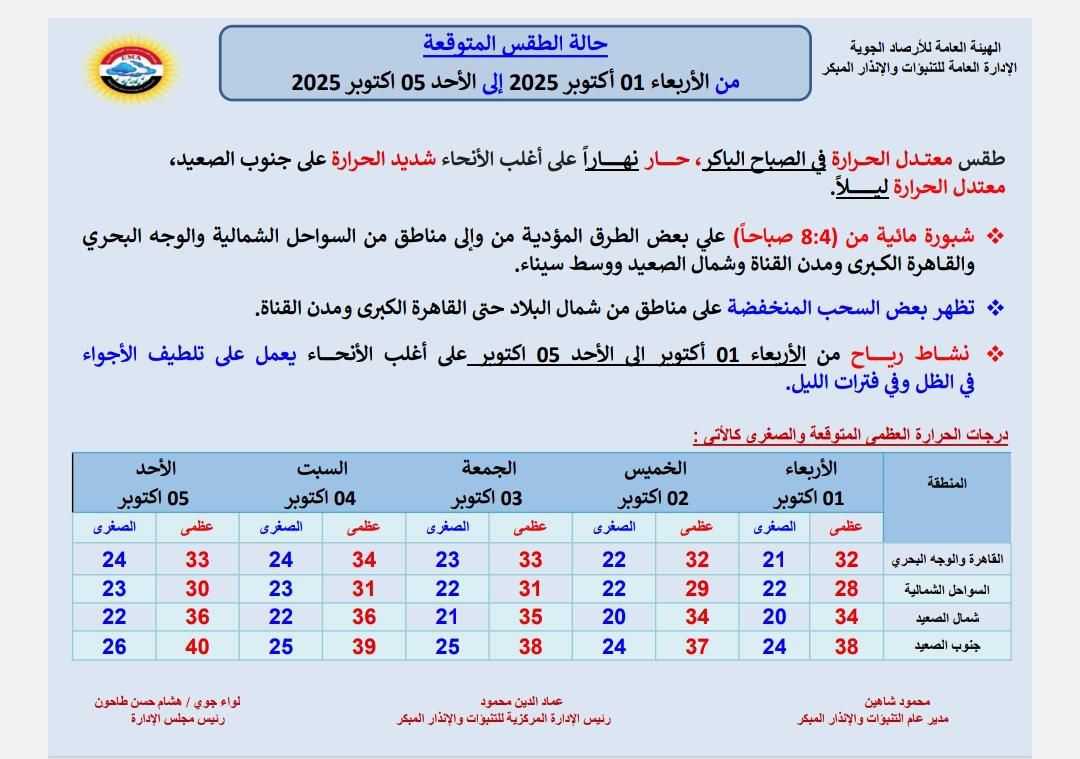 كشفت الهيئة العامة للأرصاد الجوية ان حالة الطقس غدا الأربعاء 1 أكتوبر 2025 ستشهد شبوره مائية تبدا من الساعة 4:00 صباحا وتمتد حتى 8:00 صباحا او ذلك على بعض الطرق المؤدية من والى مناطق من السواحل الشمالية والوجه البحري والقاهرة الكبرى والمدن القناه وشمال الصعيد ووسط سيناء، بالإضافة الى ظهور بعض السحب المنخفضة على المناطق من شمال البلاد حتى القاهرة الكبرى ومدن القناه، ونشط للرياح على اغلب الانحاء يساعد على تلطيف الأجواء في الظل وفي فترات الليل، كما ستسجل درجه الحراره غدا في القاهرة والوجه البحري 32 العظمى 21 للصغرى وفي السواحل الشمالية 28 للعظمى 22 للصغرى وفي شمال الصعيد 34 العظمى و20 للصغرى، وفي جنوب الصعيد 38 العظمى 24 للصغرى.