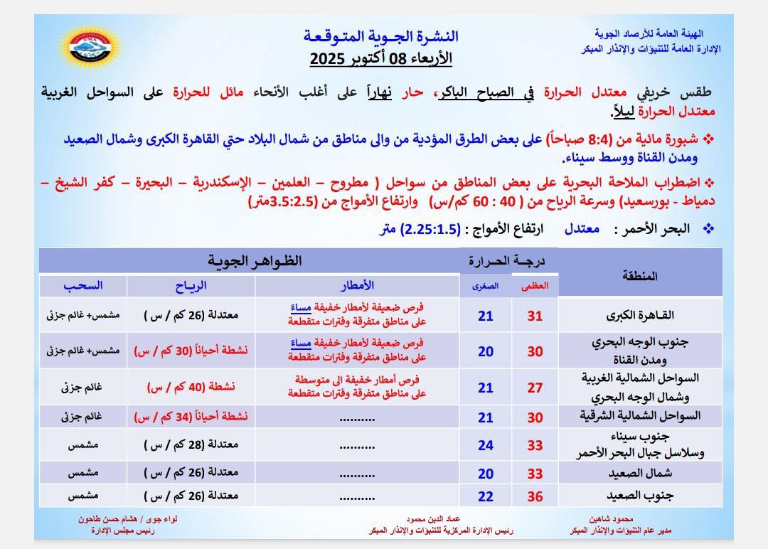 اعلنت الهيئة العامة للأرصاد الجوية ان حالة الطقس اليوم الأربعاء 8 أكتوبر 2025 ستشهد ظواهر جويه جديده، منها اضطراب في الملاحة البحرية على بعض مناطق من سواحل العالمين والإسكندرية ومطروح وكفر الشيخ ودمياط وبورسعيد، لتصل سرعه الرياح من 40 الى 60 كلم على الساعة وارتفاع الأمواج من 2.5 الى 3.5 امتار، بالإضافة الى فرص ضعيفة الامطار خفيفة مساء على مناطق متفرقه من جنوب الوجه البحري والقاهرة الكبرى ومدن القناه على فترات متقطعة، وفرص امطار خفيفة الى متوسطة على مناطق من السواحل الشمالية الغربية وشمال الوجه البحري على فترات متقطعة، وأشارت الهيئة العامة للأرصاد الجوية انه سيسود غدا طقس خريفي معدات الحراره في الصباح الباكر وحار نهارا على اغلب الانحاء، لتكون درجه الحراره في جنوب الصعيد من 36 العظمى الى 37 للعظمى وفي شمال الصعيد من 33 العظمى الى 34 العظمى.