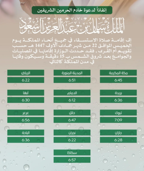 دعا خادم الحرمين الشريفين الملك سلمان بن عبد العزيز الي إقامة صلاة الاستسقاء في جميع انحاء المملكة العربية السعودية، المقرر اقامتها يوم الخميس الموافق 13 نوفمبر 2025 والموافق 22 جمادي الأول 1447 هجرياً، كما اكد عن ضرورة أداء هذه الصلاة والاكثار من الاستغفار والتوبة لتفريج الكروب، والالحاح بالدعاء ، كما اعتمدت الوزارة إقامة الصلاة بعد شروق الشمس بـ 15 دقيقة وفقاً لتوقيت ام القري، وأنهت استعداداتها وجميع الاعمال والإجراءات اللازمة لإقامتها في الجوامع المحددة بمختلف المناطقة بالمملكة.