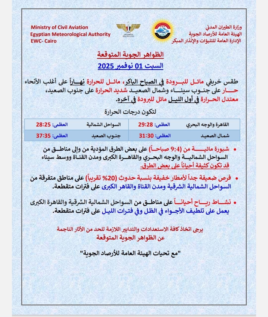 اعلنت الهيئة العامة للأرصاد الجوية ان حالة الطقس غدًا السبت 1 نوفمبر 2025 ستشهد شبوره مائية من الساعة 4:00 صباحا حتى الساعة 9:00 صباحا على بعض الطرق المؤدية من والى مناطق من السواحل الشمالية والوجه البحري والقاهرة الكبرى ومدن القناه ووسط سيناء قد تكون كثيفه أحيانا على بعض الطرق، بالإضافة الى فرص ضعيفة جدا لأمطار خفيفة بنسبه حدود 20% تقريبا على مناطق متفرقه من السواحل الشمالية الشرقية ومدن القناه والقاهرة الكبرى على فترات متقطعة، ونشاط للرياح على مناطق من السواحل الشمالية الشرقية والقاهرة الكبرى يساعد على تلطيف الأجواء في الظل وفي فترات الليل على فترات متقطعة، كما سيسود غدا طقس خريفي مائل للبرودة في الصباح الباكر ومائل للحرارة نهارا على اغلب الانحاء وحار على جنوب سيناء وشمال الصعيد وشديد الحراره على جنوب الصعيد ومعتدل الحراره في اول الليل ومائل للبرودة في اخره.